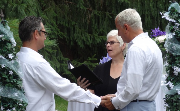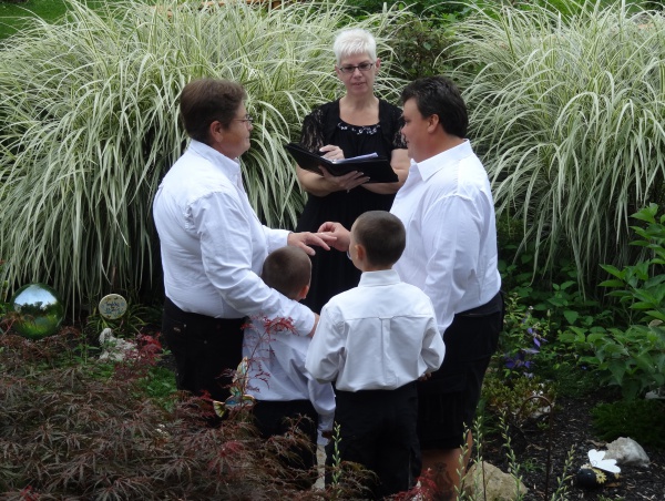 “My husband and I were married on a rainy Saturday evening in Pam’s backyard. Our tiny wedding in front of Pam’s grape arbor was picture perfect. We will cherish that memory ever so sweetly for the rest of our lives. Pam performed our modest ceremony just beautifully, and she was very attentive to our needs during the planning phase of our wedding. In fact, Pam accommodated our request to move up “the date” with joyful excitement. She also helped us find a terrific photographer! We are so happy to have met Pam. She is a wonderful person, and we recommend her highly.”